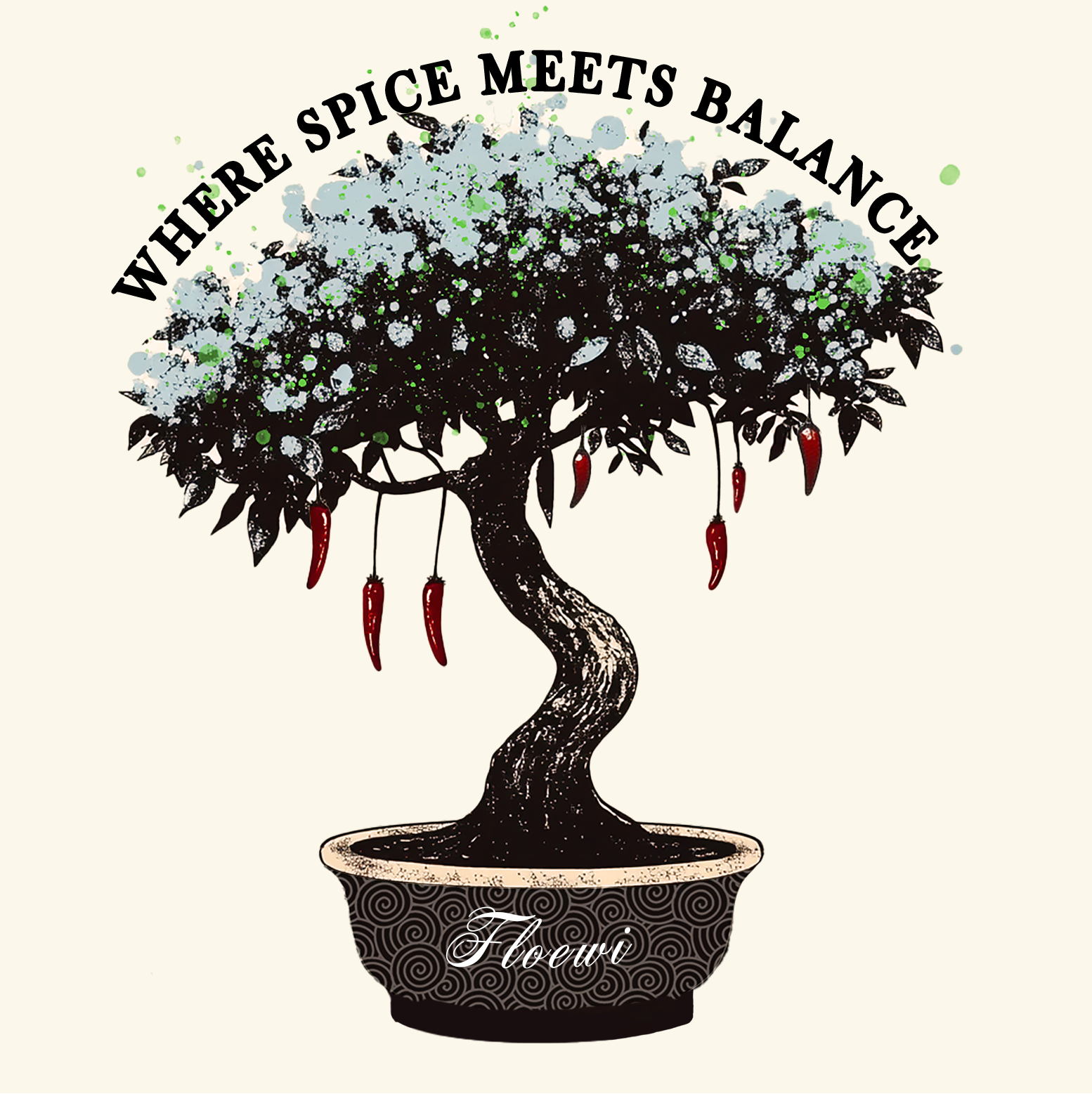 Ze symboliseren kracht, passie en het pittige randje van het leven. De combinatie van de serene bonsaiboom en de vurige pepers vormt een unieke balans – precies zoals de uitdrukking "Where Spice Meets Balance" beschrijft.