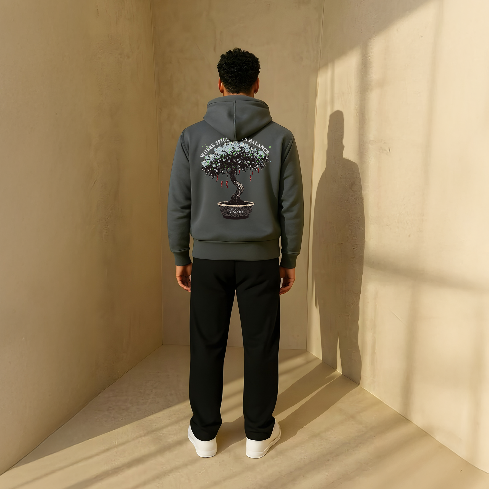 Find your balance. Embrace style and comfort with the versatile Floewi Unisex Hoodie. This unisex hoodie is perfect for any occasion, whether you're relaxing at home or making a statement on the go. The subtle front design is beautifully complemented by the bold, artistic print on the back: a graceful bonsai tree with fiery chili peppers.